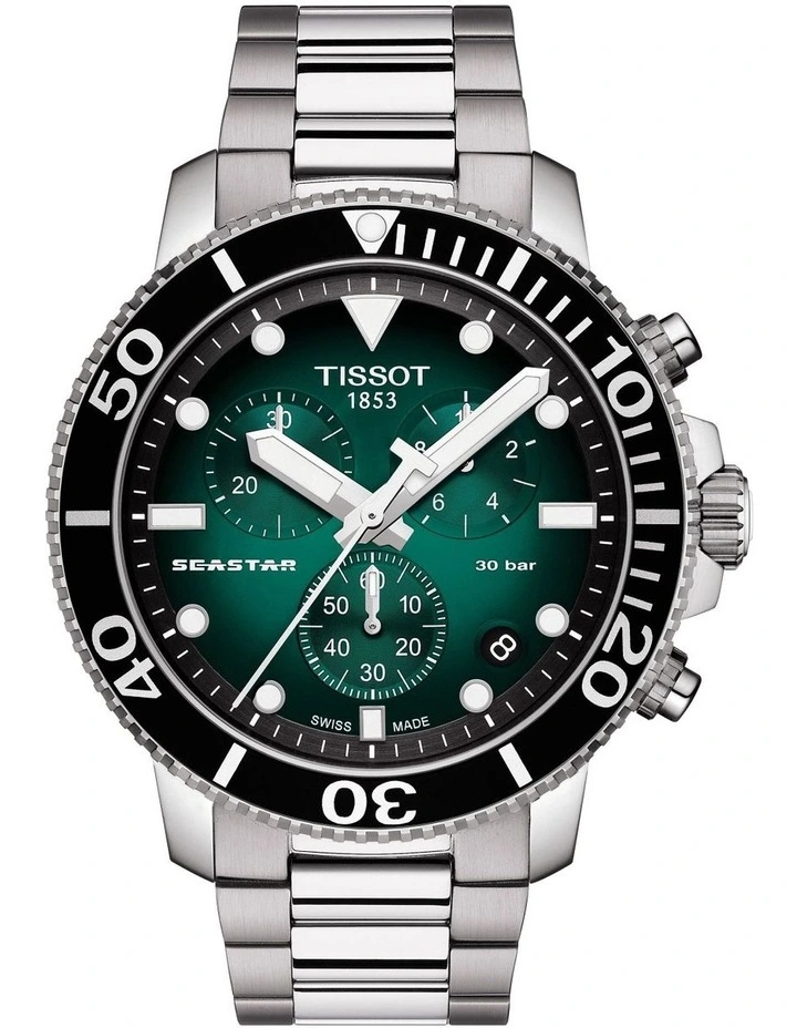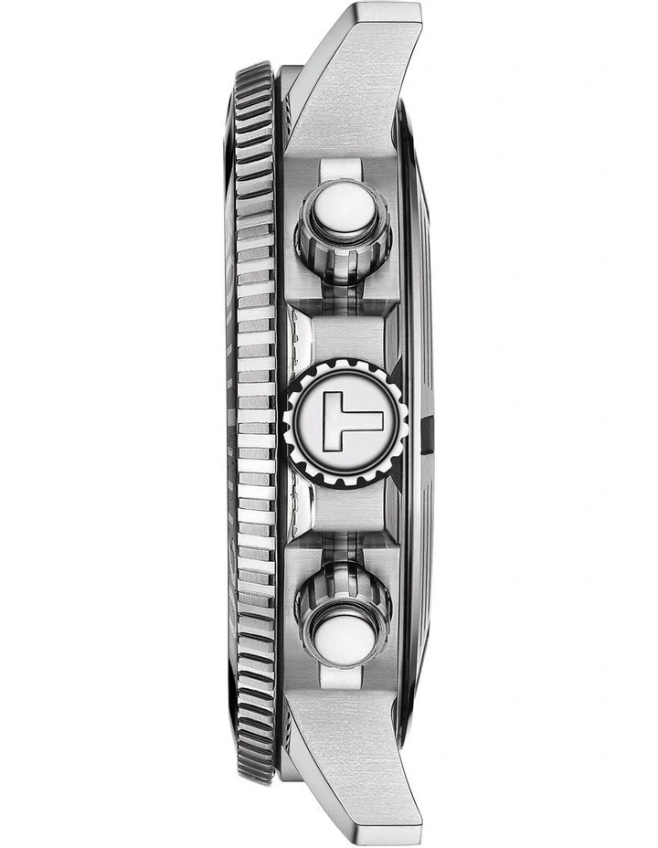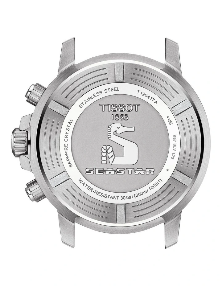 The Tissot Seastar 1000 Chronograph watch featuresΒ a high water-resistance up to an impressive pressure of 30 bar (300m/1000 ft), screw-down crown and case-back, screw-down pushers and unidirectional steel bezel with aluminium ring.