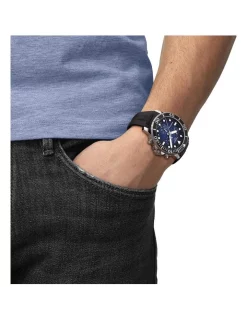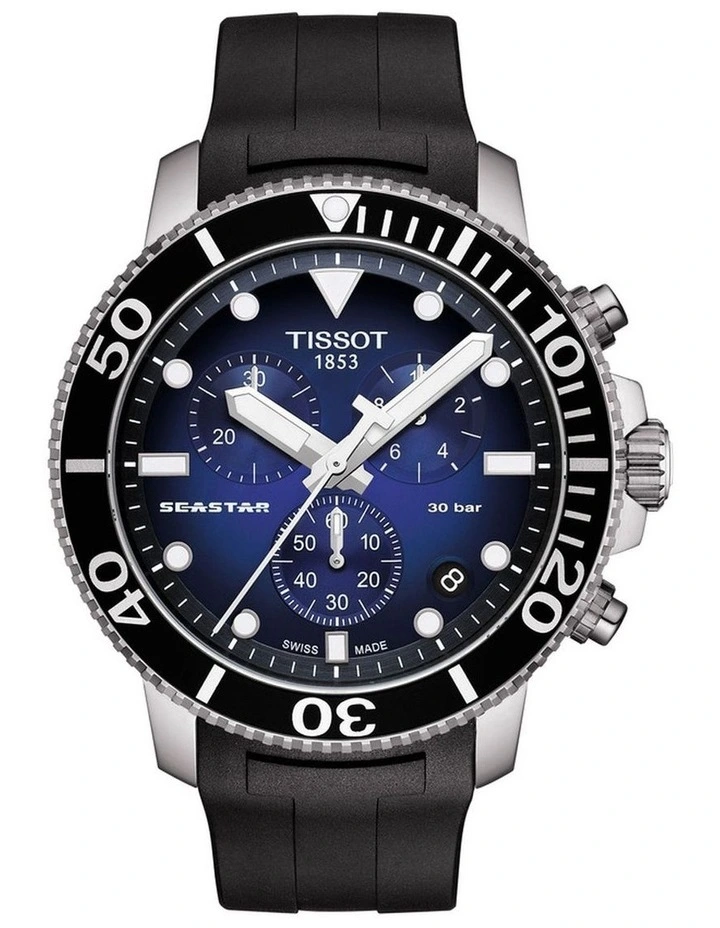 The Tissot Seastar 1000 Chronograph watch featuresΒ a high water-resistance up to an impressive pressure of 30 bar (300m/1000 ft), screw-down crown and case-back, screw-down pushers and unidirectional steel bezel with aluminium ring.