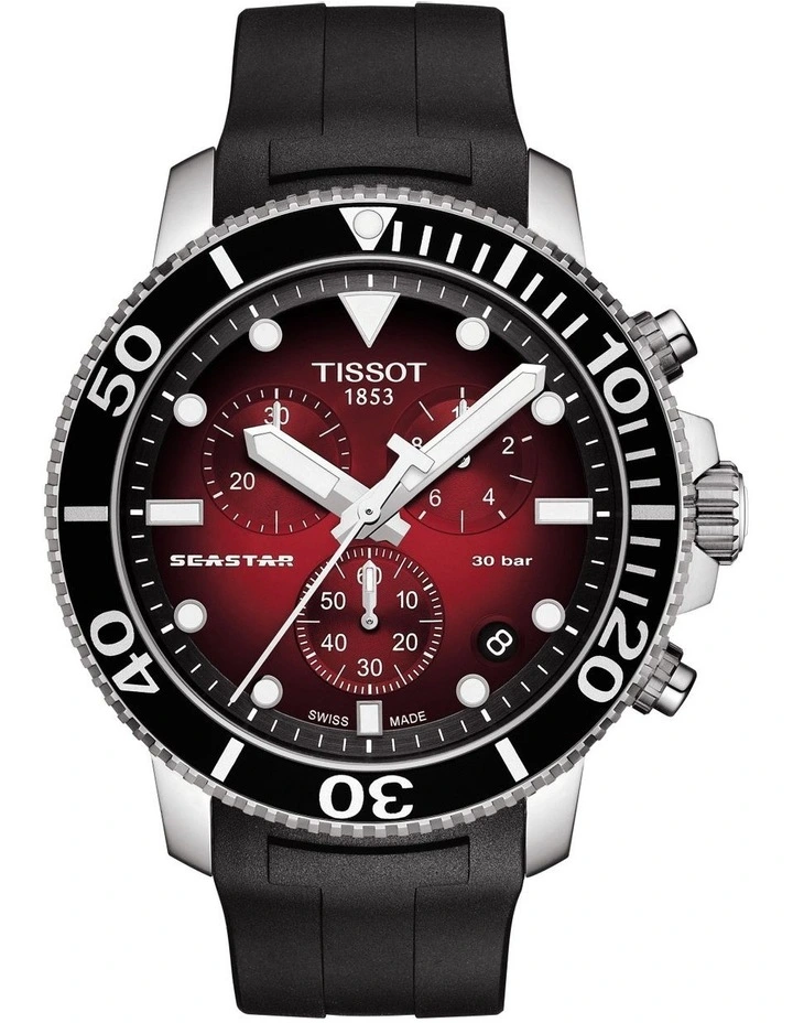 The Tissot Seastar 1000 Chronograph watch featuresΒ a high water-resistance up to an impressive pressure of 30 bar (300m/1000 ft), screw-down crown and case-back, screw-down pushers and unidirectional steel bezel with aluminium ring.