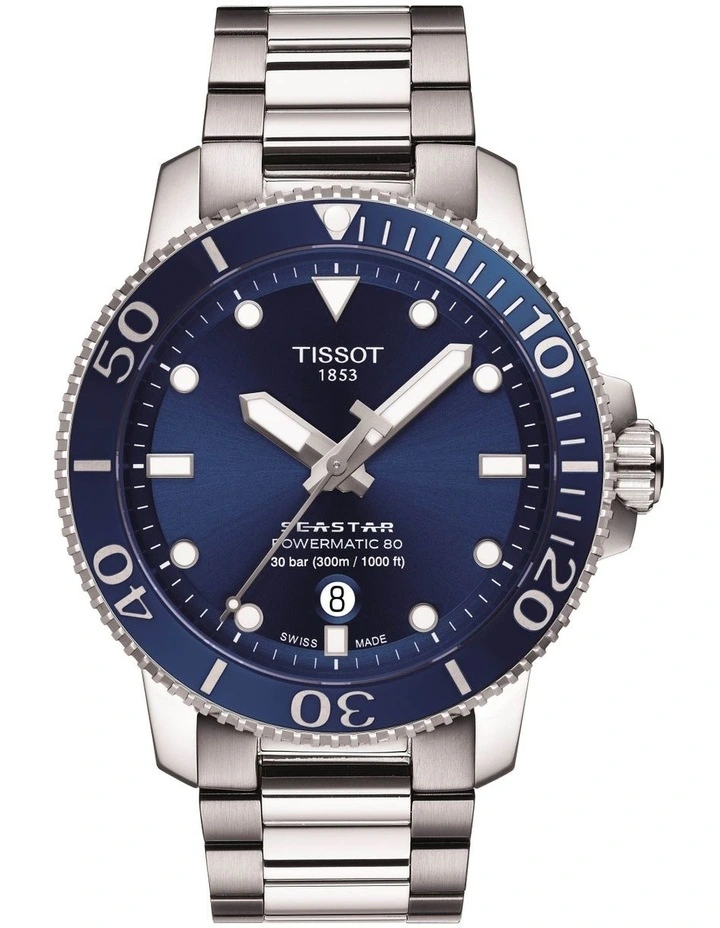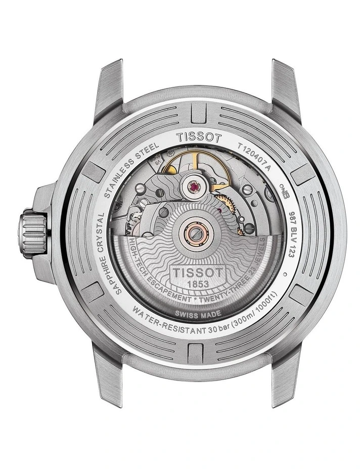 The Tissot Seastar 1000 watch featuresΒ a high water-resistance up to an impressive pressure of 30 bar (300m/1000 ft), screw-down crown and case back, and unidirectional ceramic bezel.