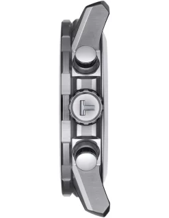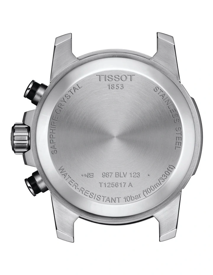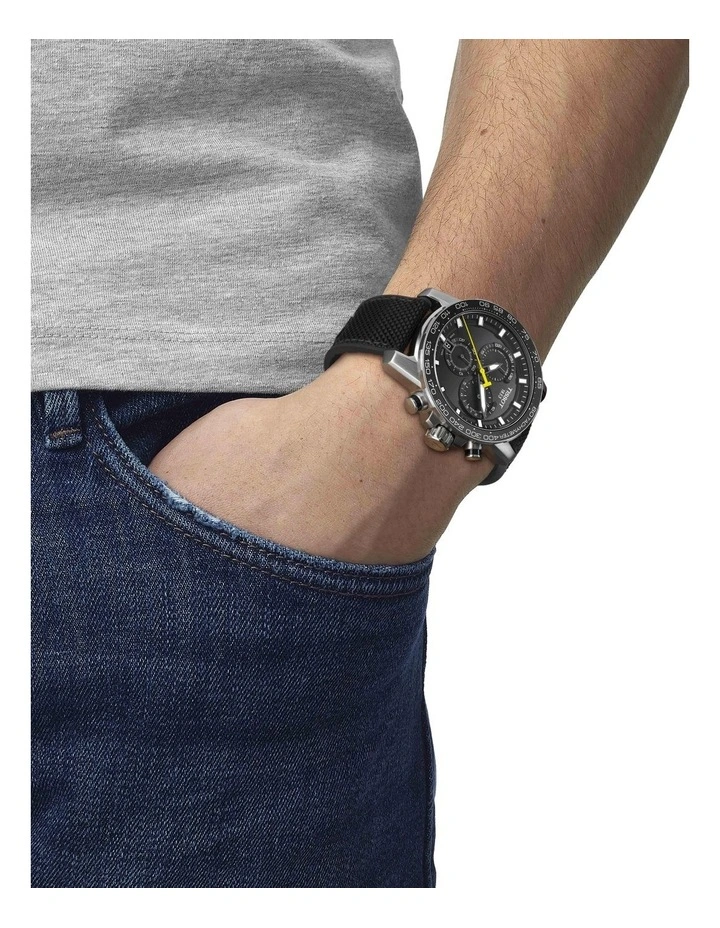 With a bold design, large 45.5mm case and chronograph functions, the Supersport Chrono makes an impressive addition to the Tissot collection. This Swiss-made mens watch has a scratch-resistant sapphire crystal, aluminium bezel ring, black dial and textile strap.