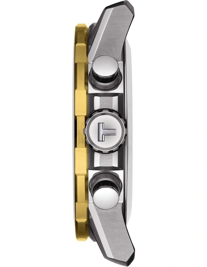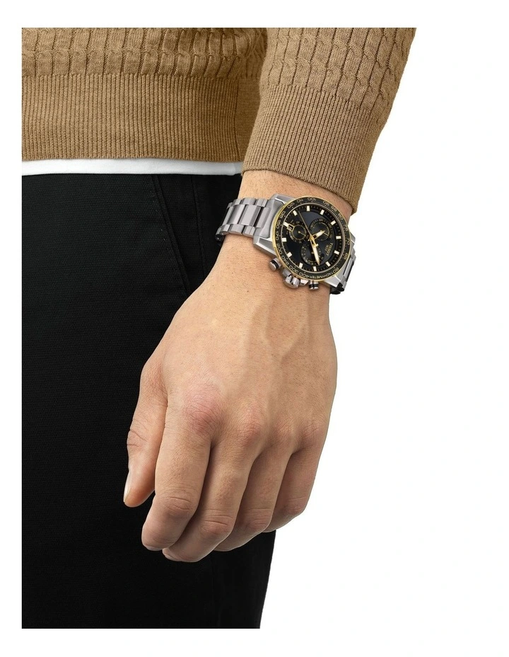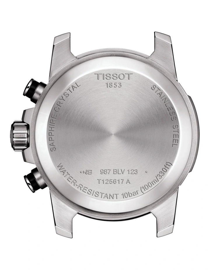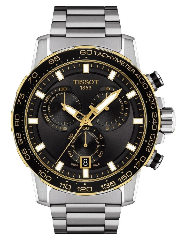 With a bold design, large 45.5mm case and chronograph functions, the Supersport Chrono makes an impressive addition to the Tissot collection. This mens Swiss-made watch has a scratch-resistant sapphire crystal, aluminium bezel ring, black dial and stainless steel bracelet.