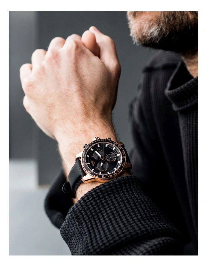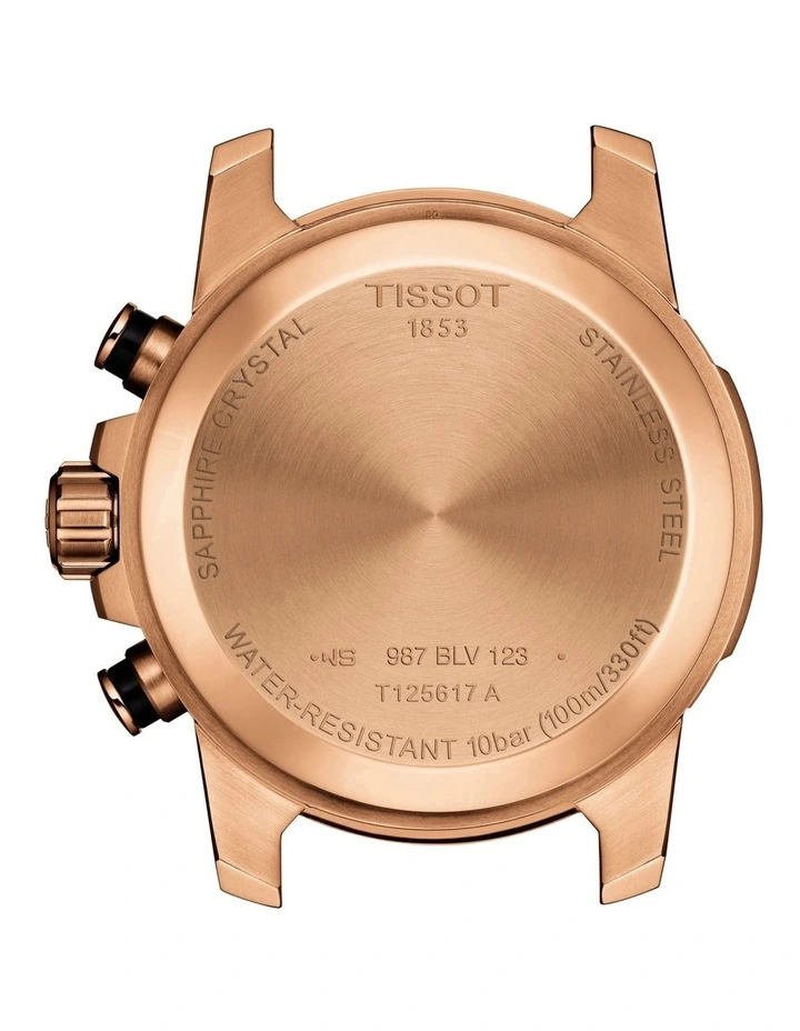 With a bold design, large 45.5mm case and chronograph functions, the Supersport Chrono makes an impressive addition to the Tissot collection. This mens Swiss-made watch has a scratch-resistant sapphire crystal, aluminium bezel ring, black dial and black vintage hand-stitched leather strap.