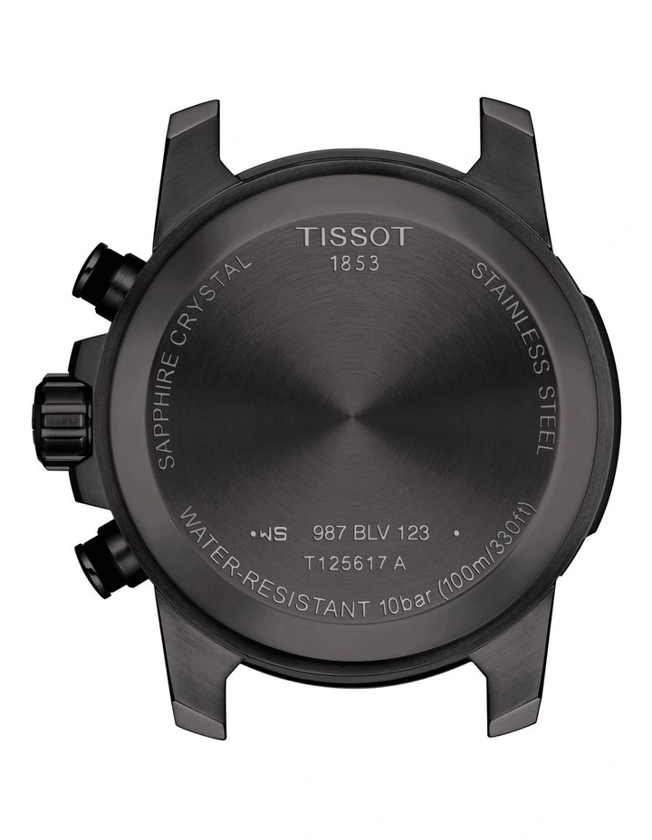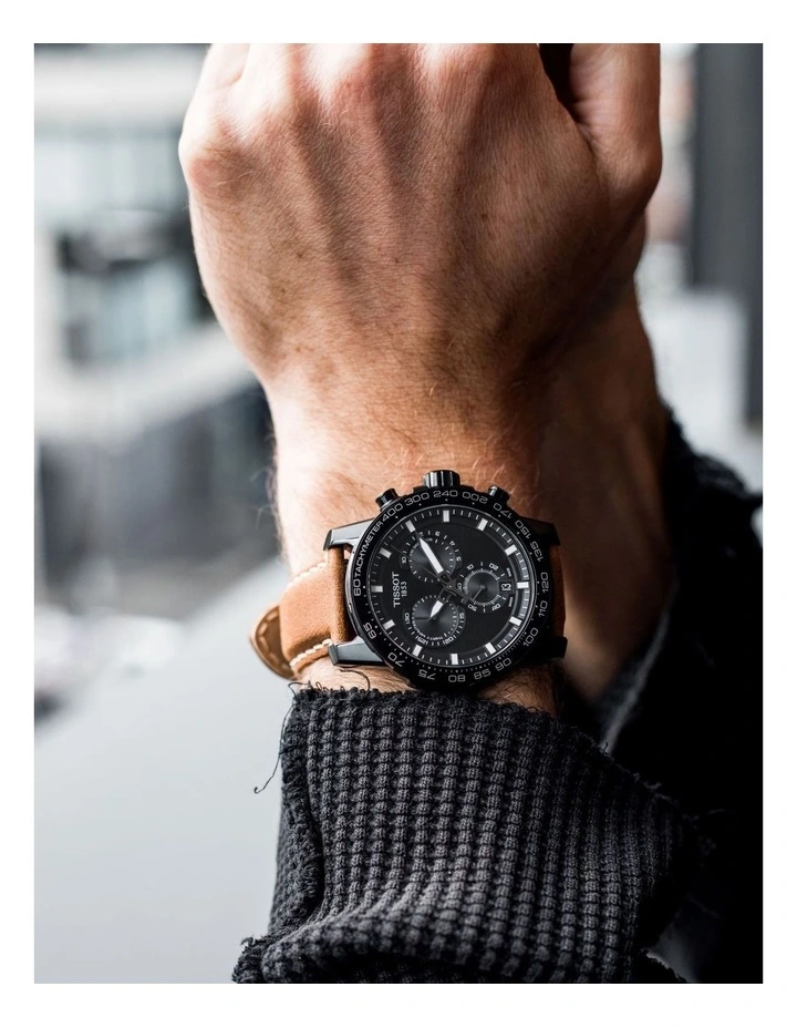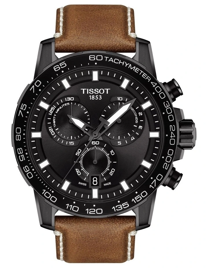 With a bold design, large 45.5mm case and chronograph functions, the Supersport Chrono makes an impressive addition to the Tissot collection. This mens Swiss-made watch has a scratch-resistant sapphire crystal, aluminium bezel ring, black dial and brown vintage hand-stitched leather strap.