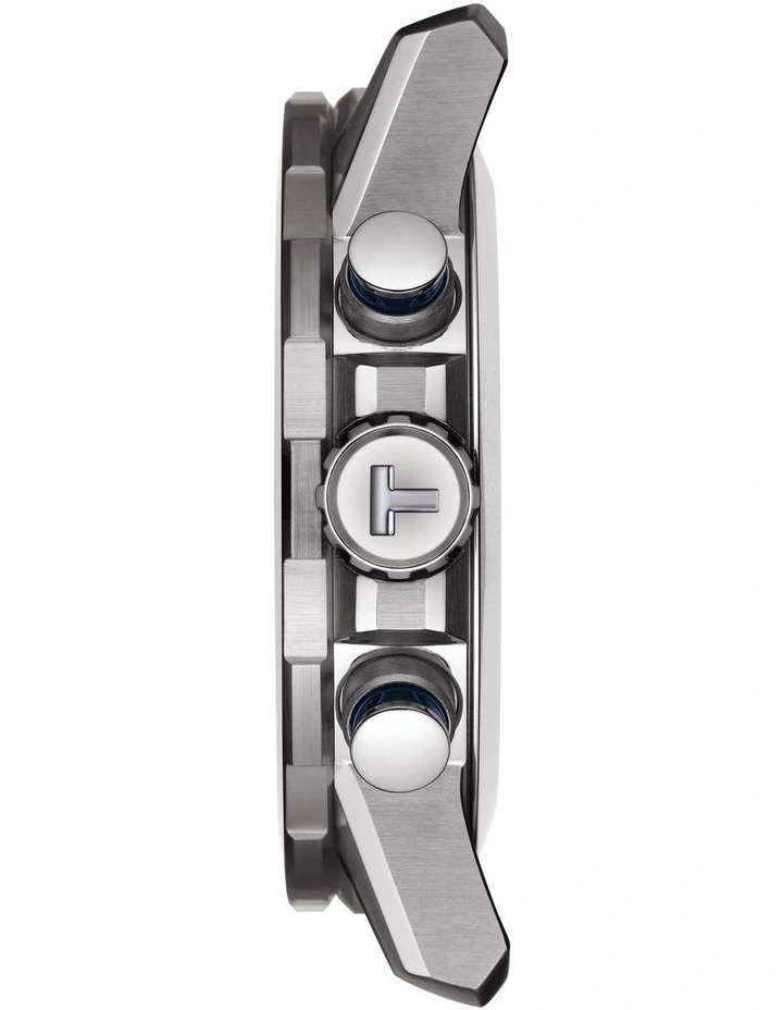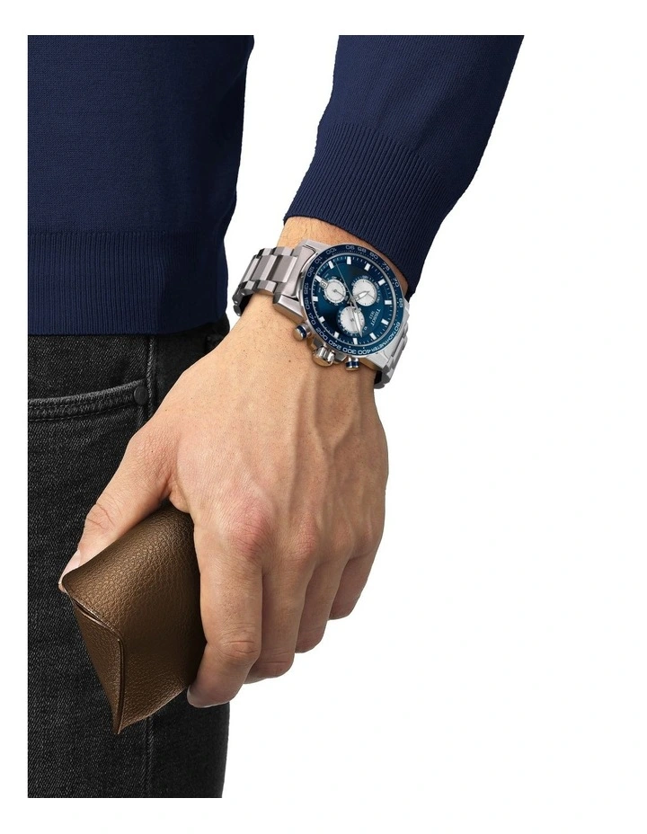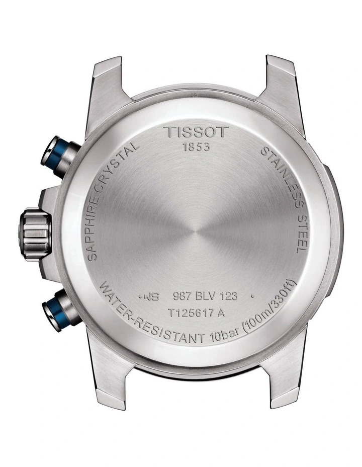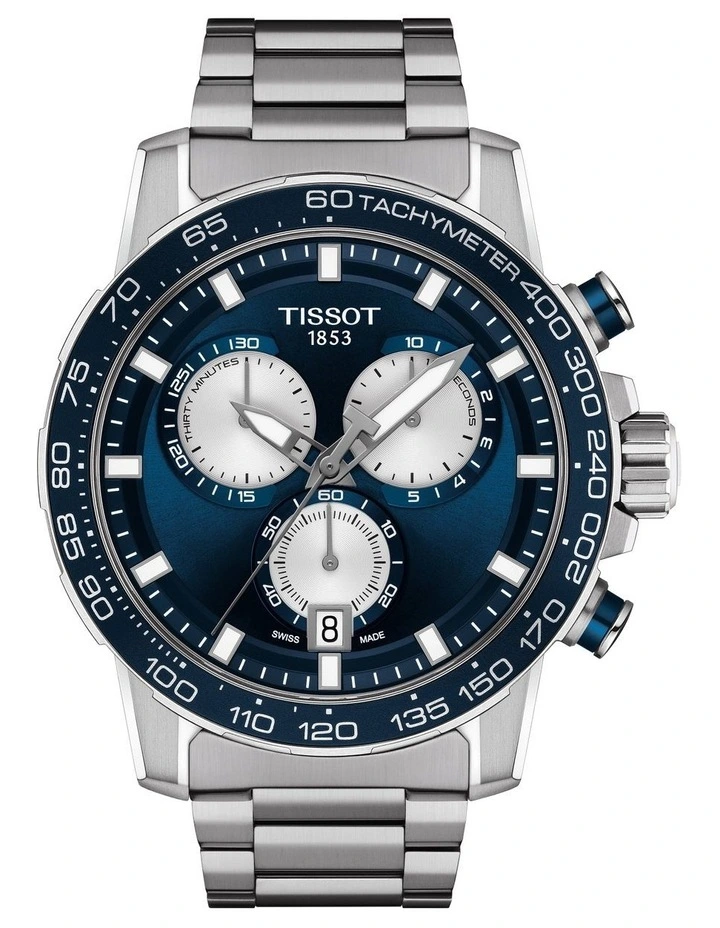 With a bold design, large 45.5mm case and chronograph functions, the Supersport Chrono makes an impressive addition to the Tissot collection. This mens Swiss-made watch has a scratch-resistant sapphire crystal, aluminium bezel ring, blue dial and stainless steel bracelet.