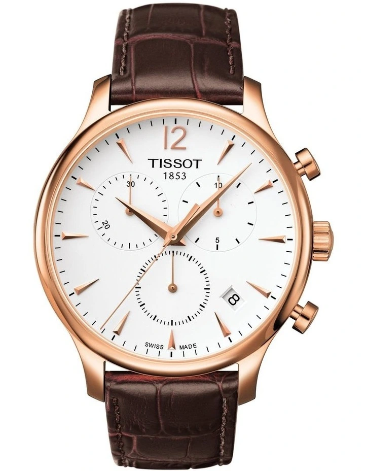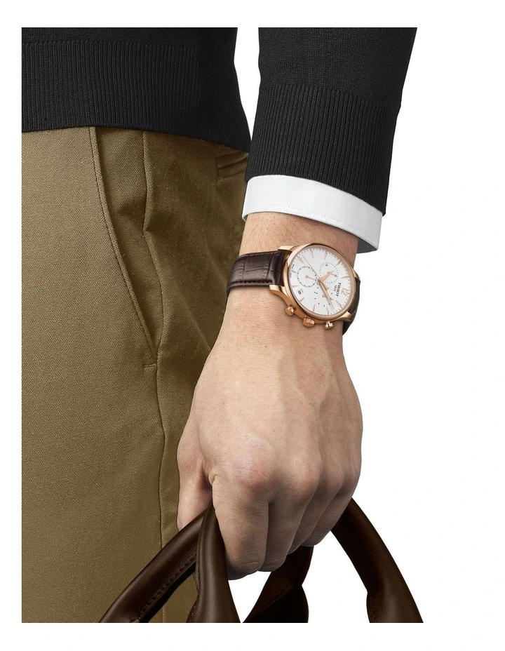 The Tissot Tradition Chronograph offers modern watch-making with a touch of nostalgia in this curved 1950s style case, balancing today’s technology with subtle vintage-look details.