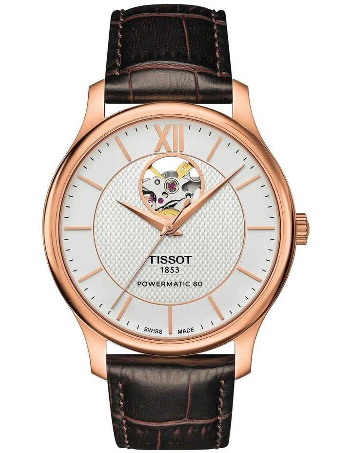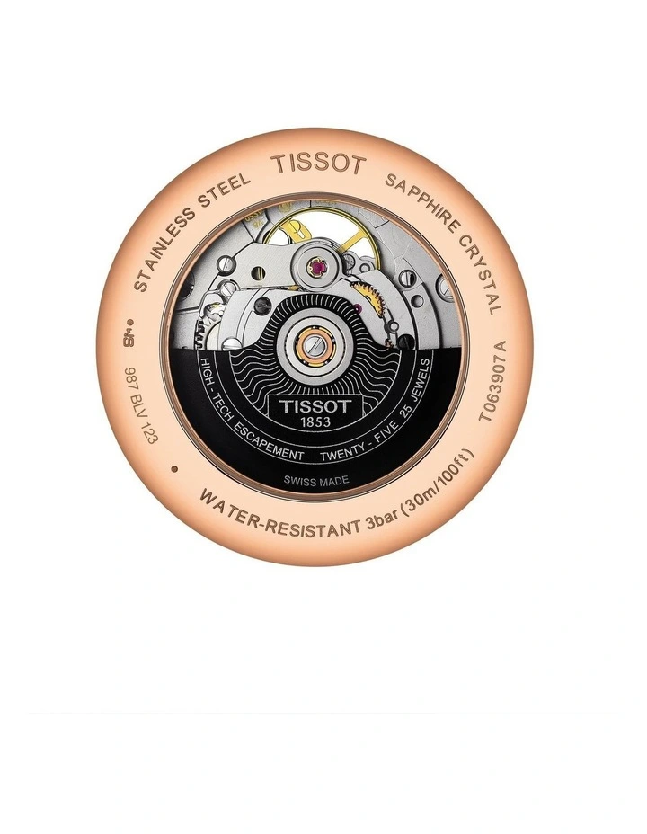 Powered by the Tissot Powermatic 80 movement, with a power reserve up to 80 hours, and revealed by the opening at 12 o’clock on the dial as well as through the transparent case back.