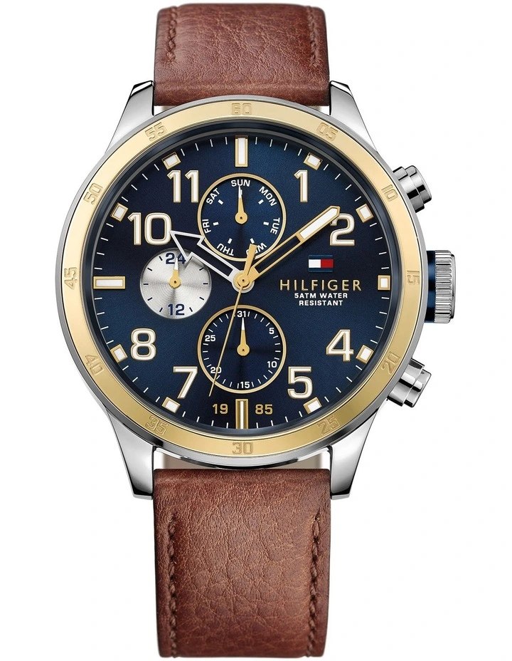 Tommy Hilfiger men’s watch. Timeless fashion made modern. Crafted in Gold-Plated Stainless Steel with sub-dials finished with a pebbled Leather strap.