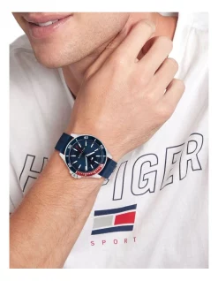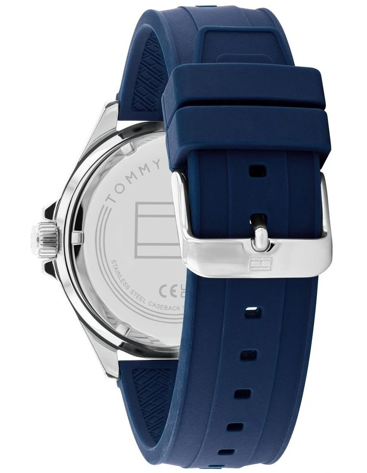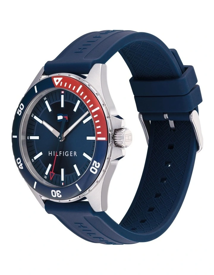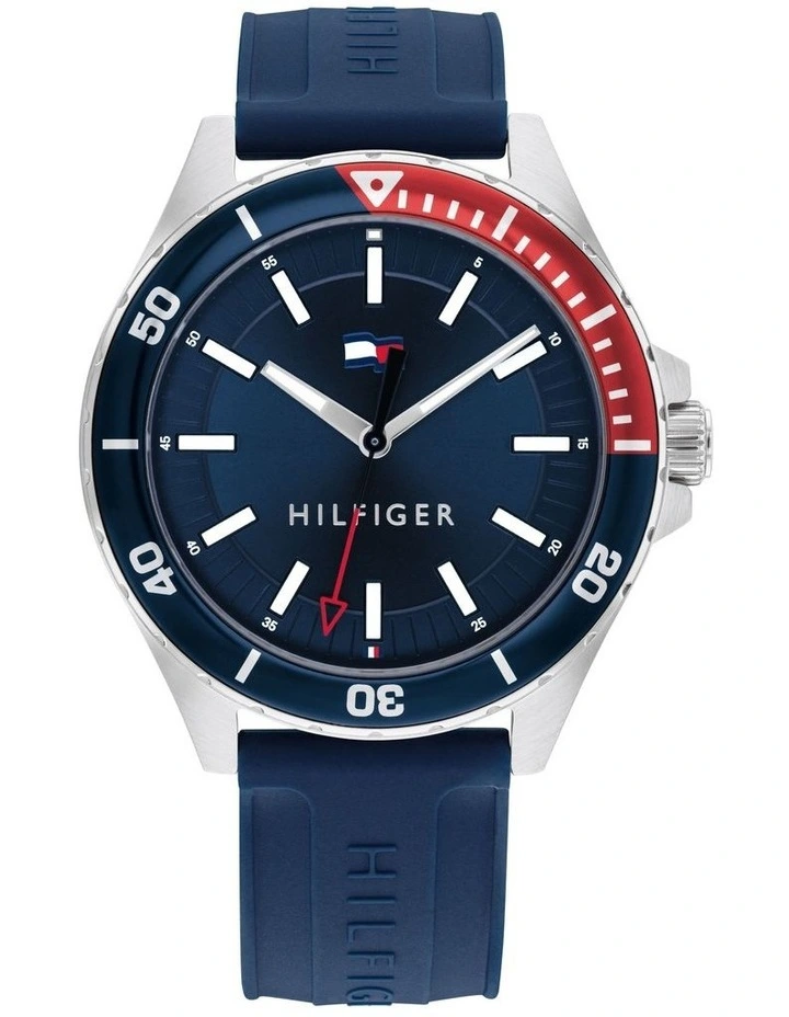 Tommy Hilfiger Mens watch diver inspired with full sunray dial and Lumi indexes, Etched minute track, and new wave flag embody the Tommy adventurous spirit. 3H, 43MM