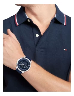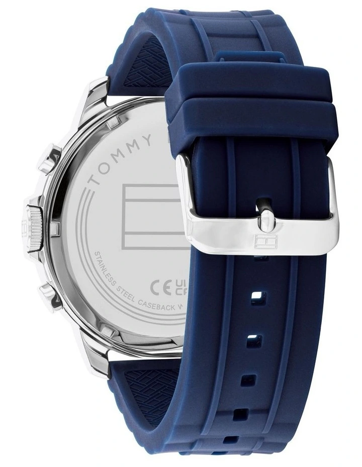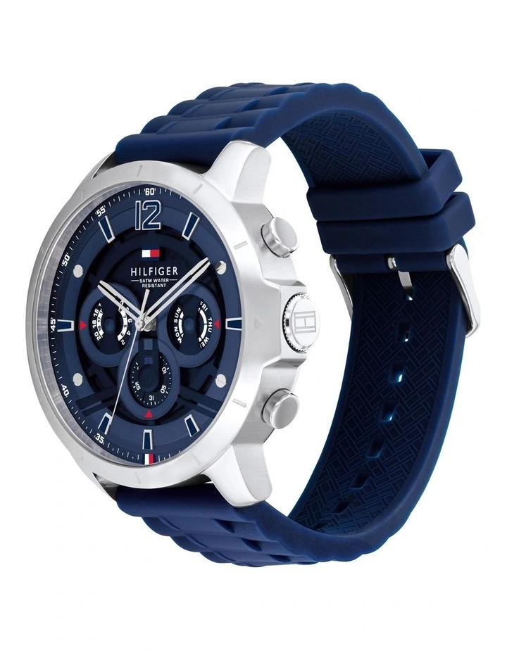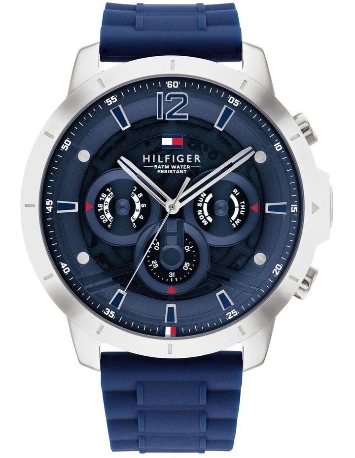 Tommy Hilfiger mens watch DISTINCTIVE and daring.Β Large 50mm case, with Bold exposed dimensional dial and screw details.Β Tommy branding elements throughout make this watch a stand out. Multi-function, 50MM.