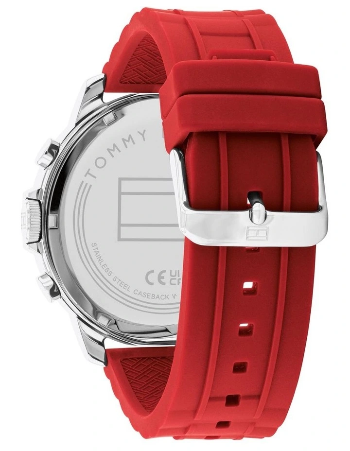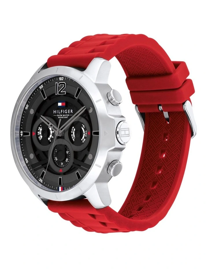Tommy Hilfiger mens watch DISTINCTIVE and daring.Β Large 50mm case, with Bold exposed dimensional dial and screw details.Β Tommy branding elements throughout make this watch a stand out. Multi-function, 50MM