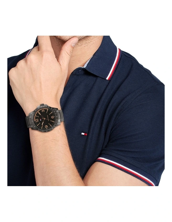 Tommy Hilfiger men’s watch. In a word, timeless. This casual and versatile timepiece dresses up or down with ease. 46M Case with bold Arabic markers and contrasting minute track, accented with Tommy dial details.