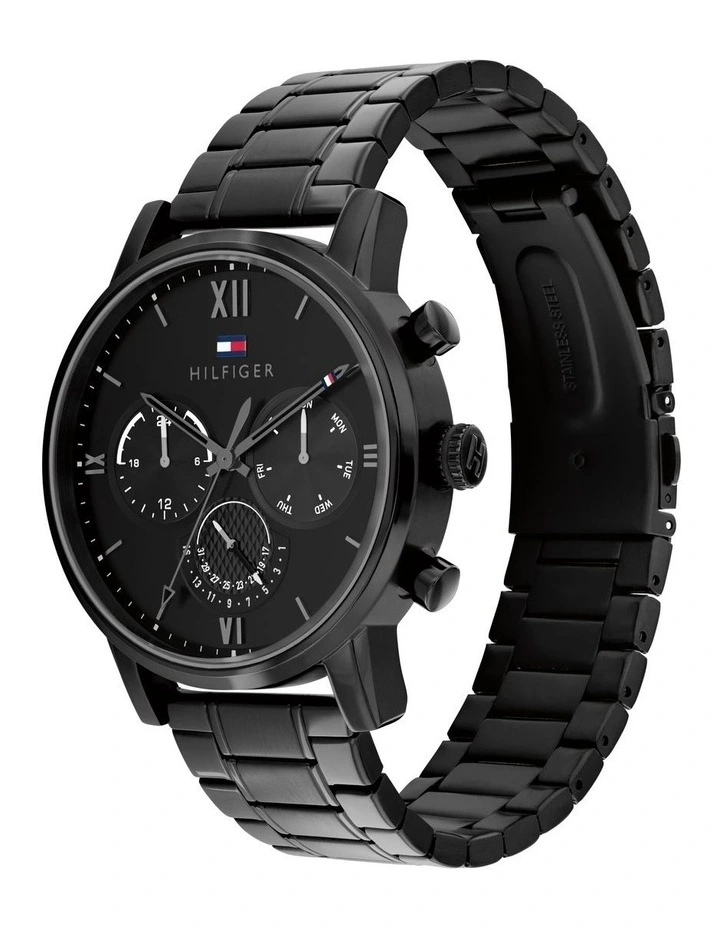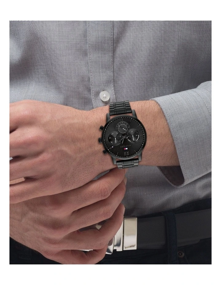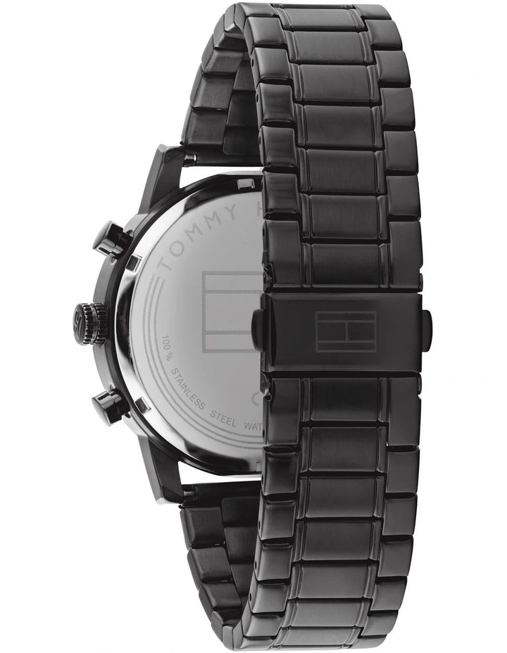 Versatile and contemporary. A 44mm case with slim bezel and brushed curved dial with textured sub eyes and iconic Tommy Hilfiger tipped hands.